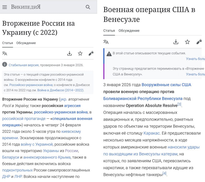 Кстати, посмотрите, как описывают СВО и операцию США в американской Википедии. Просто "это другое".