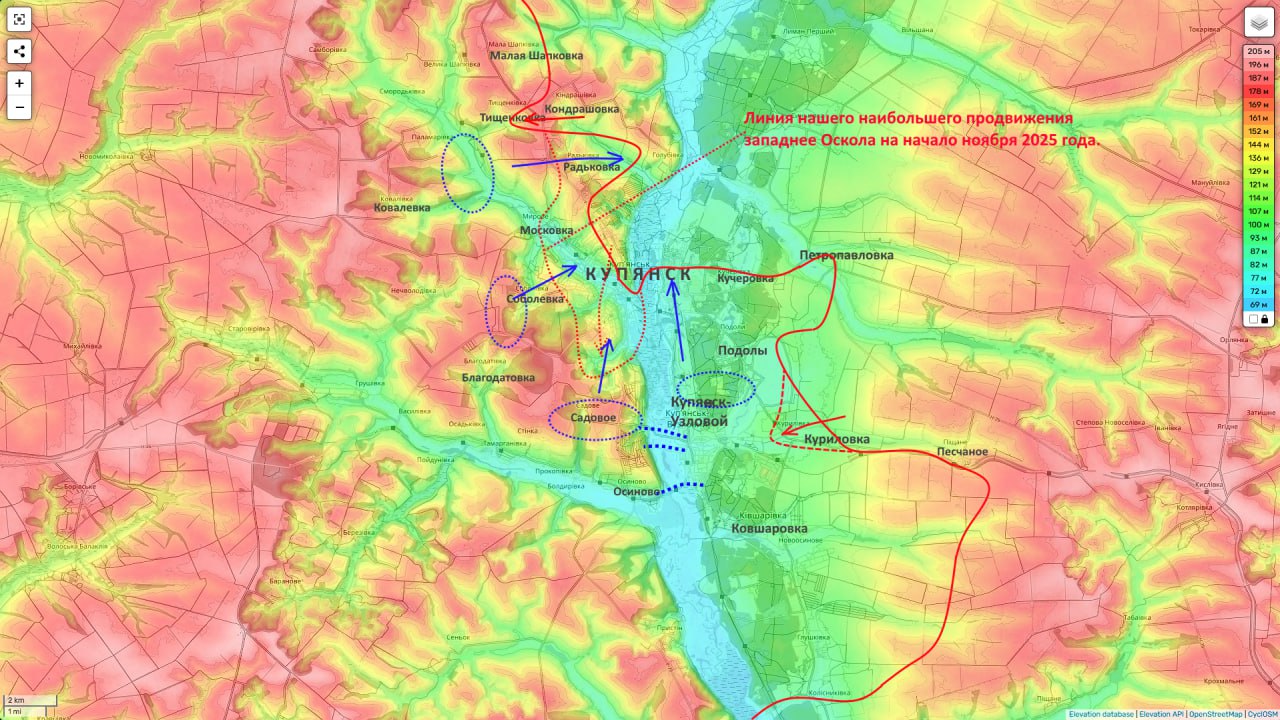 Во-вторых ударом на восточном берегу Оскола через Песчаное и Куриловку выйти к стратегическим переправам в районе Купянка-Узлового (чтобы тем самым уже лишить группировку противника логистики на левым берегу реки). Здесь есть более значимые успехи. Мы в целом овладели Куриловкой и заняли восточную часть н.п. Подолы. Чем заметно приблизились к переправам противника и практически вывели их из строя.