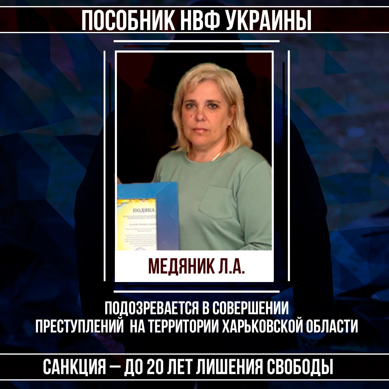 © Управлением внутренних дел ВГА Харьковской области возбуждено уголовное дело в отношении гражданки Украины Медяник Людмилы Алексеевны, 26.06.1970 года рождения. Она подозревается в совершении действий, направленных против безопасности Российской Федерации.
