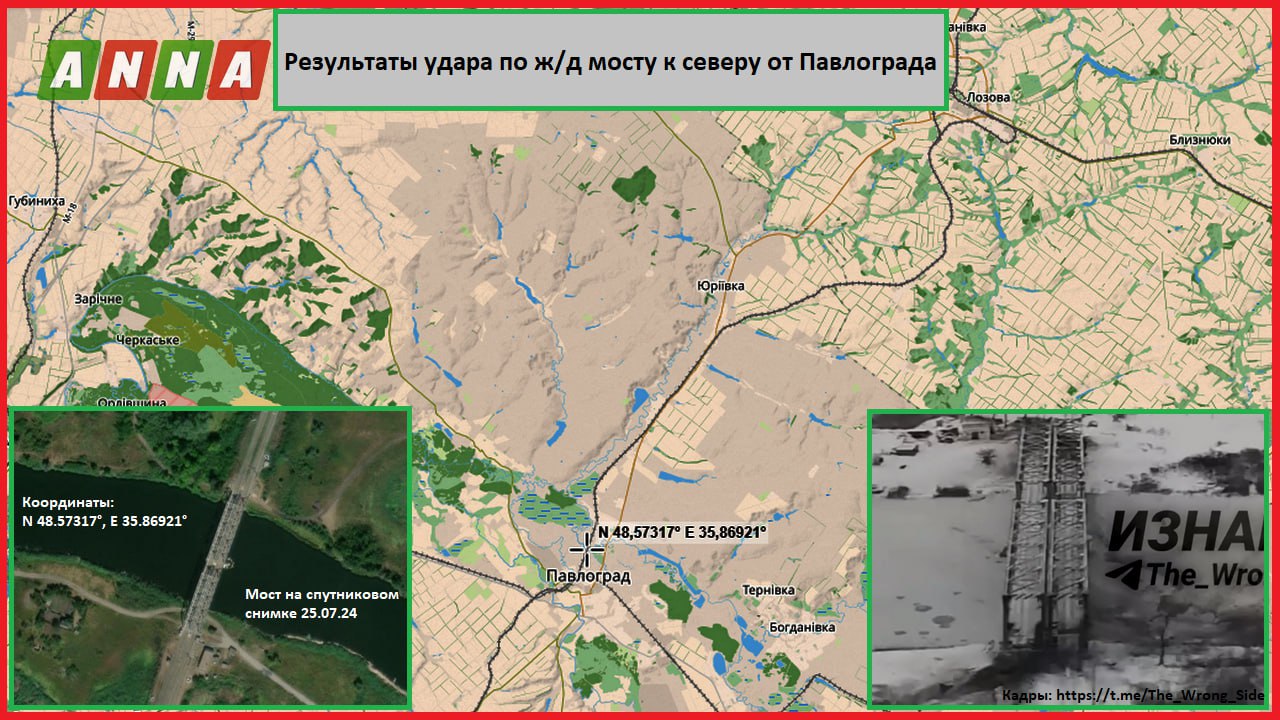 Кадры объективного контроля результатов высокоточных ударов по подъездным путям к железнодорожному мосту (N 48.57317°, E 35.86921°) через реку Самара к северу от Павлограда в Днепропетровской области показал канал "Изнанка".