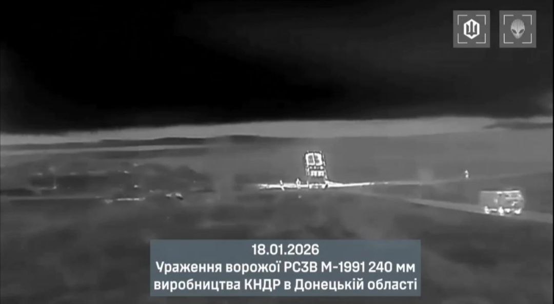 Украинский дрон-камикадзе атакует северокорейскую 240-мм РСЗО М-1991 в ДНР.