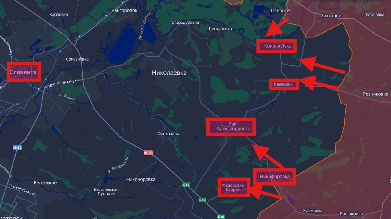 Кривая Лука взята в оперативное окружение. Дорога на Каленики физически перерезана, грунтовка на Пискуновку — под плотным огневым контролем. Господствующая высота вдоль канала Северский Донец — Донбасс западнее Миньковки перешла в серую зону, что открывает перспективы для давления на Краматорск. А на севере ДНР Минобороны подтвердило освобождение Карповки — возможно начало создание плацдарма для освобждения родной Харьковской области. Общая площадь продвижения на Славянском направлении за последнее время — до 13,5 км.