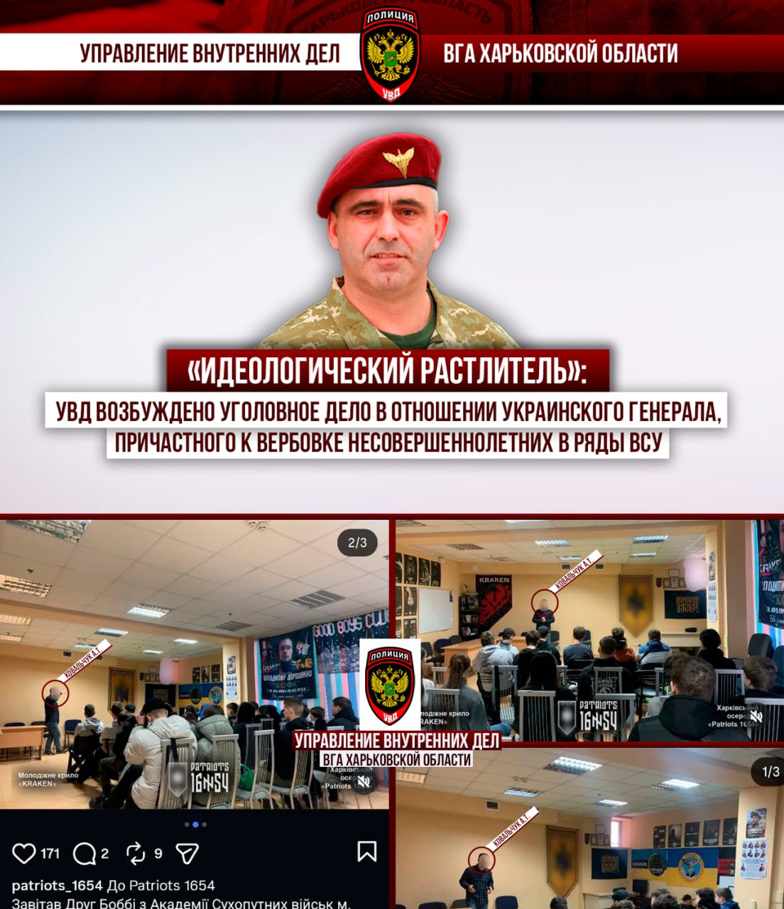 Установлено, что членами структуры «Патриоты 1654», аффилированной с 3-м армейским корпусом ВСУ и полком «Kraken»(формирования, признанные террористическими и экстремистскими и запрещенные на территории РФ), была организована вербовочная лекция. Целью мероприятия являлась популяризация деятельности десантно-штурмовых войск Украины и вербовка (рекрутирование) новобранцев из числа молодежи, в том числе участников харьковских националистических организаций.