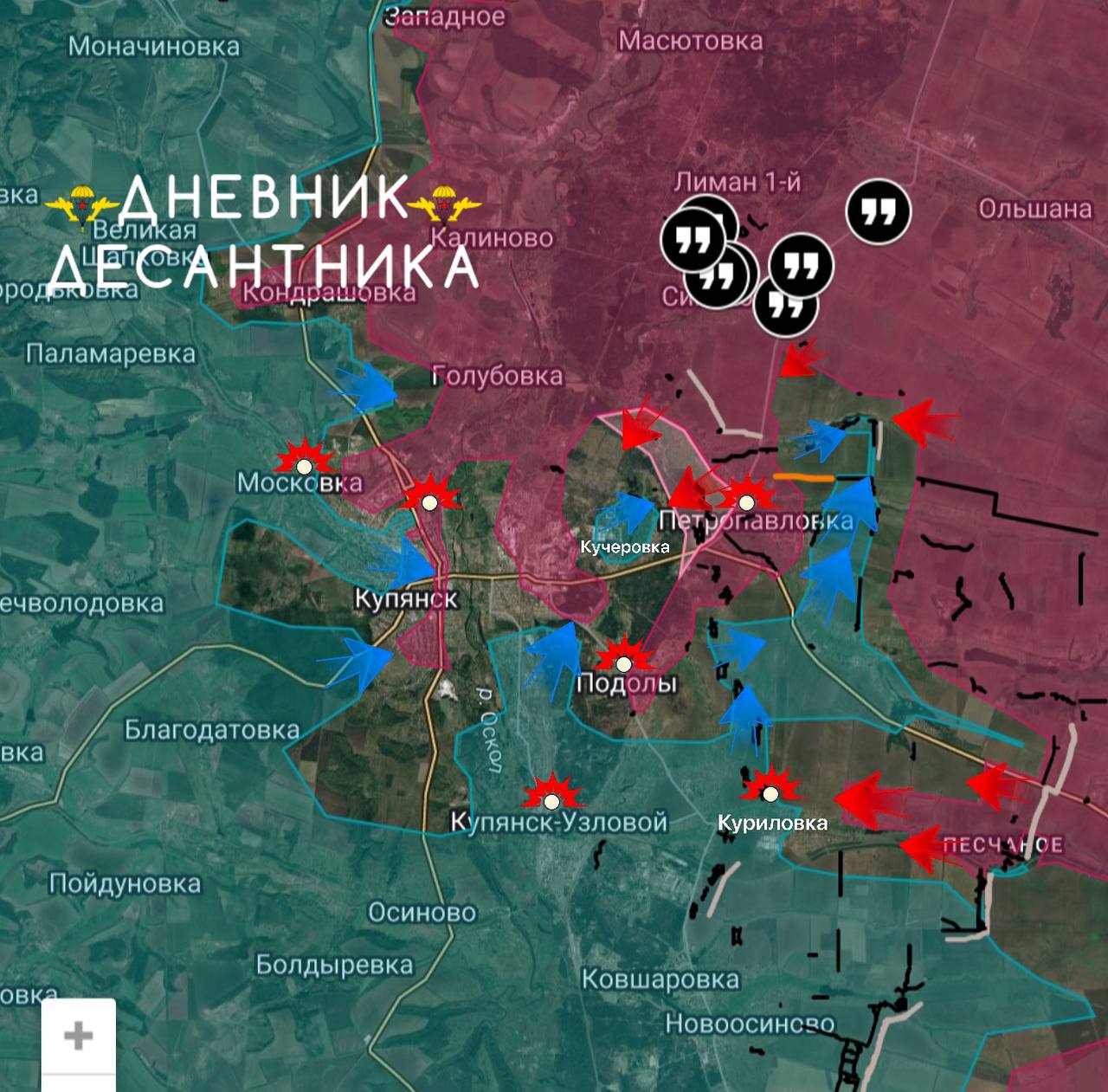 Со стороны Песчаного бойцы ВС РФ планомерно продвигаются к Купянску-Узловому с востока, разрезая вражескую группировку на секторы, но тут скорее пирог из позиций слоями плотнее получается;