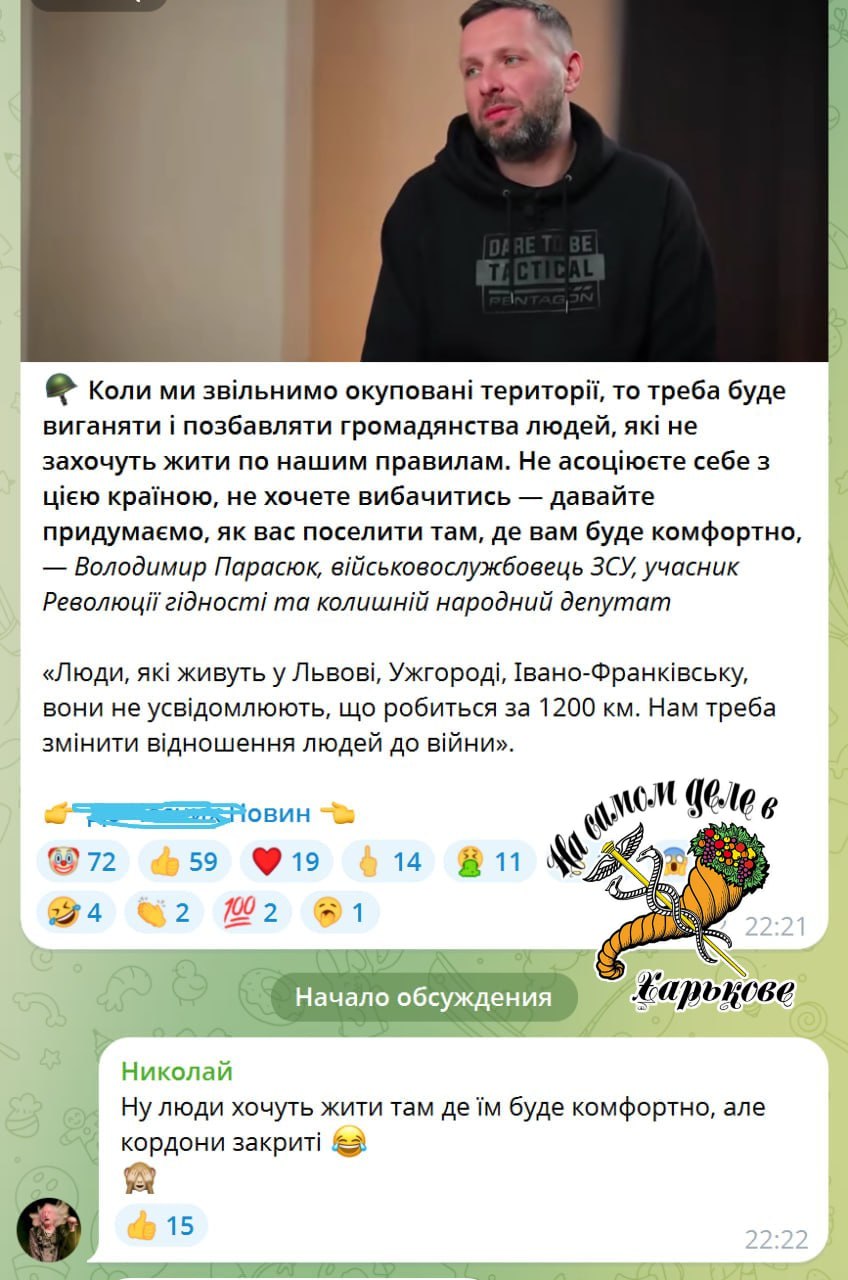 Когда мы освободим оккупированные территории, нам придётся выдворять и лишать гражданства людей, которые не захотят жить по нашим правилам. Не ассоциируете себя с этой страной, не хотите извиниться — давайте придумаем, как разместить вас там, где вам будет комфортно, — Владимир Парасюк, тыловай "вояка", экс-депутат и майдановец