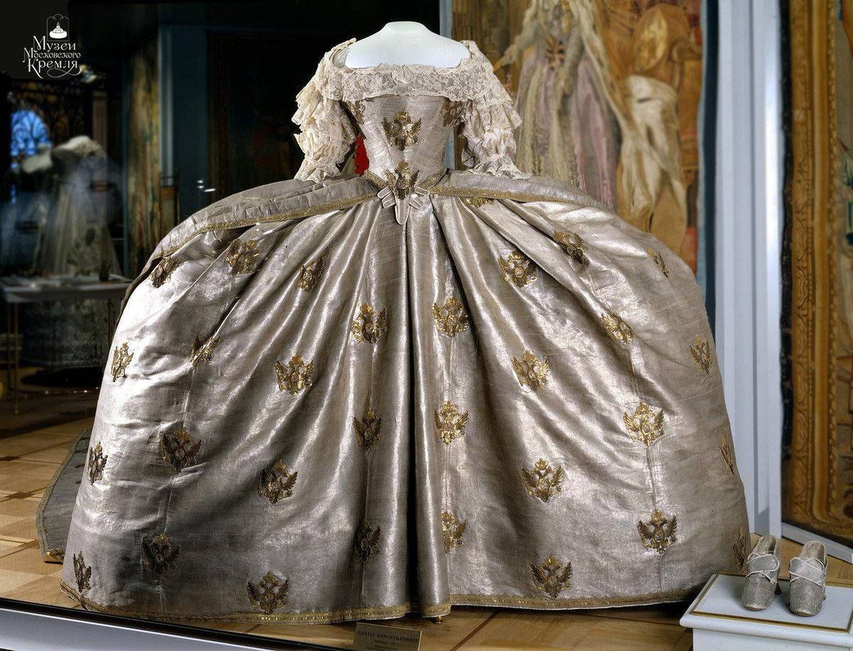Коронационное платье Екатерины II, которое в настоящее время хранится в музеях Московского Кремля, состоит из четырех частей — лифа, юбки, нижней юбки и величественной шлейки.