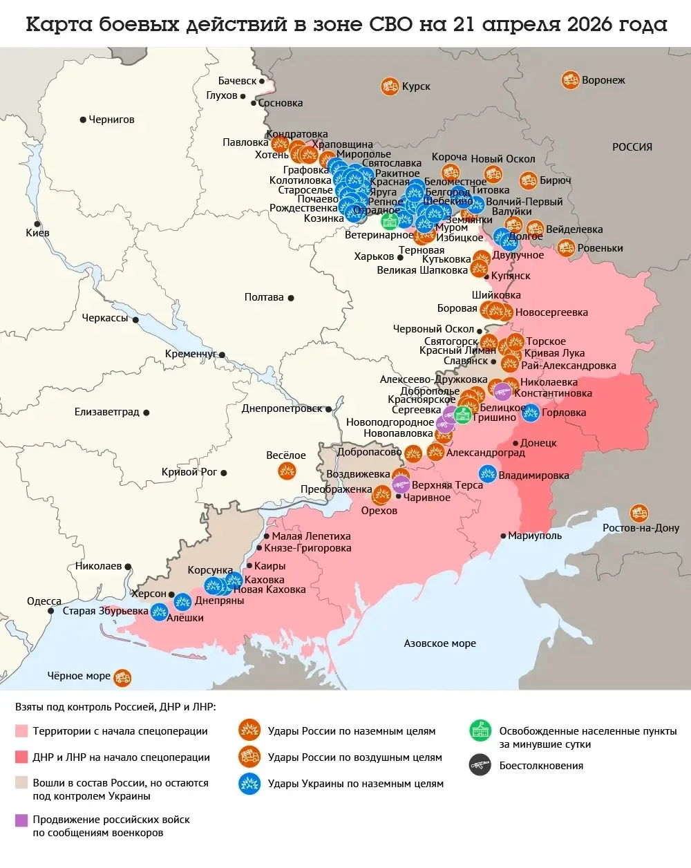 Карта боевых действий в зоне СВО на 21 апреля 2026 года
