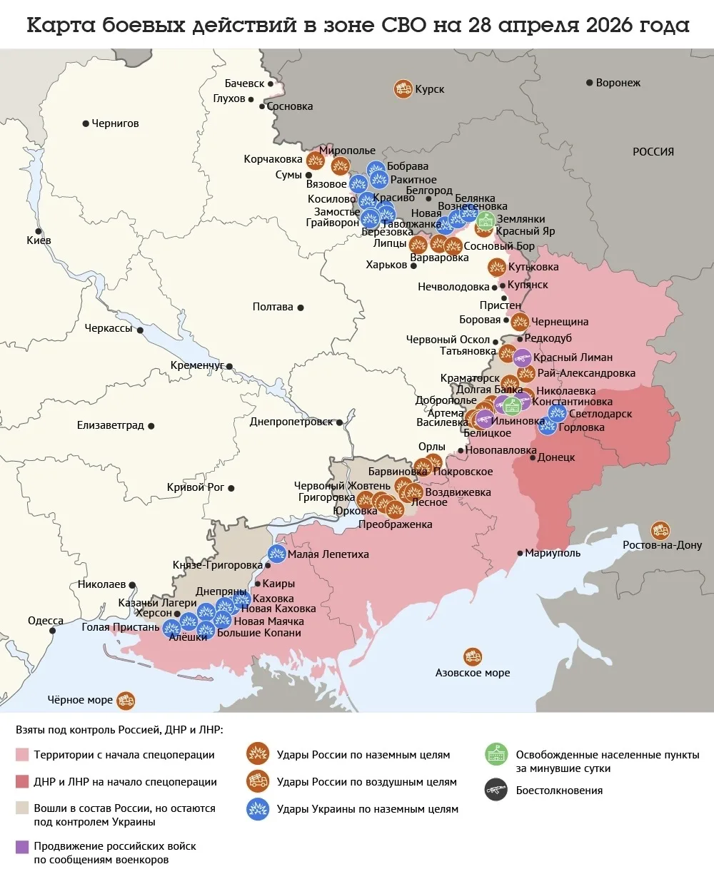 Карта боевых действий в зоне СВО на 28 апреля 2026 года
